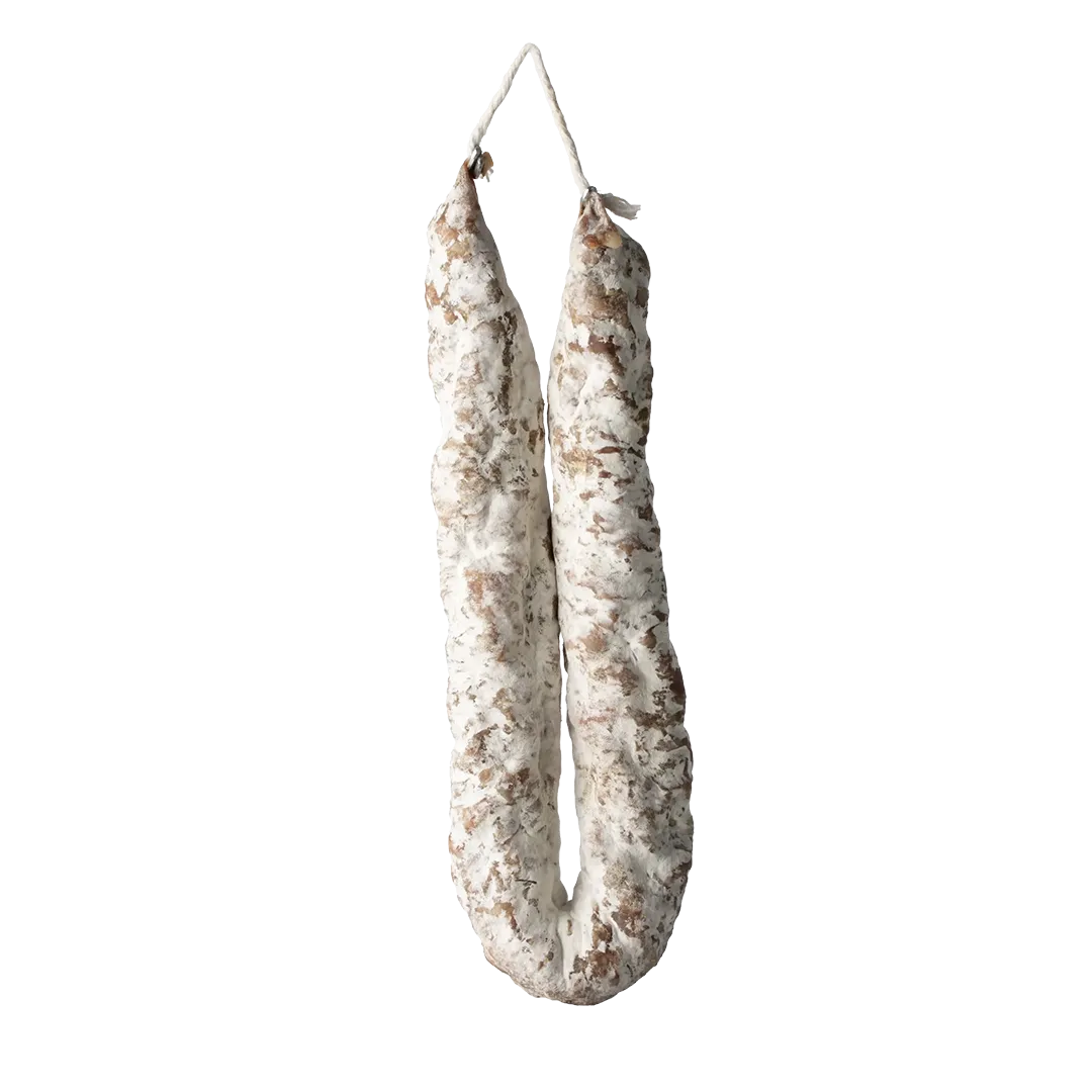 Ingrédients : Viande de porc, sel, ail, poivre, sucres, nitrate de potassium, macis, ferments, boyau naturel.